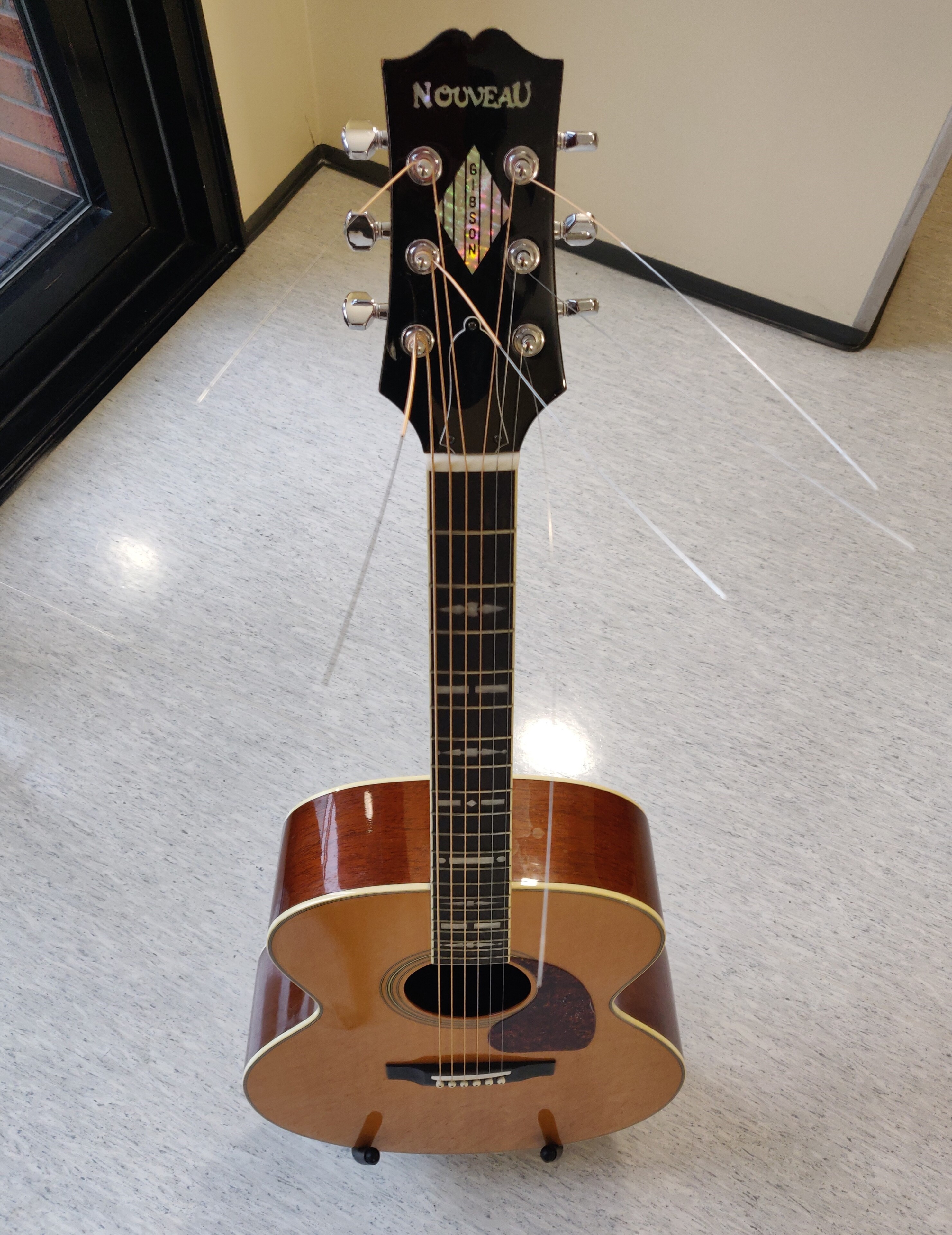 For example: this is the other guitar of the two Cecilia gave to me to research, a Gibson NV185 Nouveau series, assembled in Japan using American woods and pegs. Around 240 of these guitars slipped under quality control and as it turned out were assembled in America as well. The woods used along with the workmanship involved set a hefty price on them as they were overnight collector's items. I had hoped this was one of them but the serial number was just outside the 'magic' models released around the same time. But they're still worth serious money and there aren't many of them on the market. As you can see, the woods are extremely beautiful, the workmanship exceptional, the tone, roundness of projection, everything down to the tuning pegs are all to the highest standards. It was assembled in Japan around 1981/1983 and over the years has only developed further character of sound. These are not off-the-peg items. Today they're assembled to a buyer's specs, so there's no factory assembly, it's all done by hand in America.